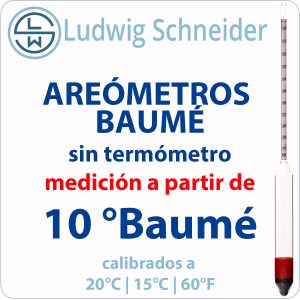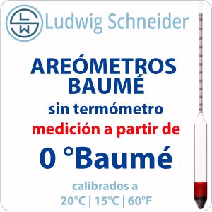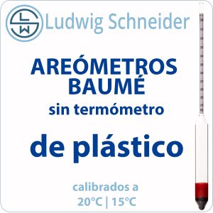 En nuestra web encontrarás la mayor oferta de Areómetros Baumé de vidrio y de plástico del mercado. Todos están fabricados por nuestra representada exclusiva Ludwig Schneider (LSW) de Alemania. LSW fabrica con los más estrictos procedimientos para asegurar la máxima calidad y precisión. Existen muchos modelos con distintas graduaciones, divisiones de rango, longitudes y temperaturas de calibración. Todos los instrumentos se suministran con estuche individual anti-rodamiento y certificado de conformidad. Por su calidad y precisión, también pueden suministrarse con certificado de calibración de fábrica (trazable a patrones oficiales) o con certificado de calibración oficial DAkkS, reconocido por ENAC.